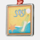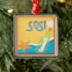 Square premium ornament with a cartoon image of a message in a bottle on a sunny sandy beach with an orange sea star and a white sand dollar. "SOS" is printed across the top in big blue island-style lettering. See the entire Shipwreck Ornament collection in the PARTY FAVORS section.