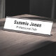 Personalise our changeable desk name plate with recipient name, job title, or other custom text. Designed in white and other colours (all colours are customisable). Available in different metal colours in two sizes – standard 2 inch x 8 inch or long 2 inch x 10 inch – and in two styles – as a desk name plate or a door name plate. No minimum order quantity and no setup fee.
