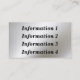 A metallic frame border in smooth silver stainless steel look chrome on the front of the card with a blue background gives a bold, unique 3d look professional-looking business card. Easily customise with your own information. Use the dynamic matching grey font shown or easily change the font style and colour. Also you can easily change the blue background to any colour. Just click on "Customise it" and then click on "edit" and "background" to change it. A unique and smart looking card, especially great for industrial, designers, artists, retail, etc. More information can be put on the back as well on the smooth metal background with dynamic black text. A strong business card that stands out from the rest.