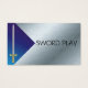 Blue and Silver Metallic Card and Mediaeval Sword with blue gradient business card template. Royal jewels and gold sword fit for a king. Customisable, font, background colours and more all online.