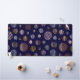 Abstract elegant gold, pink gold, silver, and copper metallic circles in seamless pattern with hand-drawn striped line texture isolated on a dark blue background.