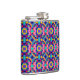 Metallic flask with vibrant geometric pattern in blue, pink, yellow, and purple. Bold design with overlapping shapes on the front and left view.