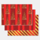 A very festive red and gold set of Christmas wrapping paper sheets featuring a pattern of contemporary gold Christmas trees made of individual gold metal snowflakes, a red gradient wrapping paper and a diagonally striped sheet with red and gold stripes. A colourful and modern gift wrap set for Christmas that will look great under the Christmas tree this year!
