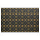 A very elegant fabric pattern featuring large, sweeping metallic gold ornaments with ornate leaves and swirls, scattered across a black background.