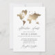 Metallic gold effect travel world map wedding invitation card. With a beautiful classic gold world map and beautiful script text. Ideal for foreign location weddings or travel lovers.