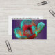 A business card featuring an unusual digital art patter of a magnolia flower in metallic shades of turquoise blue and red, on a shaded lilac / purple background