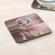 This coaster features a metallic rose sculpture with iridescent petals transitioning from white to pink to blue. The rose has detailed gold-trimmed edges on each petal and sits atop a gold stem adorned with gold leaves. The word "Peace" is in white text with a metallic gold finish on a circular gold base. The entire sculpture is on a soft, pink and rose gold background. The lighting creates a gentle reflection on the gold base, and the metallic surfaces of the rose have a high-gloss finish that catches the light, creating a luxurious, premium appearance. The coaster is a hard plastic coaster with a cork backing. The coaster set contains six coasters.