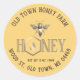 Black label with a hexagon and gold honey drip and metallic style queen bee.