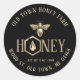 Black label with a hexagon and gold honey drip and metallic style queen bee.