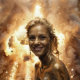 “Metamorphosis of Light” – A Surreal Portrait. Emerging from a golden tide, the woman is neither human nor elemental, but both — a manifestation of transformation. Her features dissolve into molten brilliance, representing rebirth through illumination. The artwork embodies the eternal cycle of creation, destruction, and reformation — the radiant dance between consciousness and the cosmos.