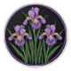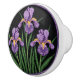 This decorative knob highlights a Métis beadwork–inspired design of three graceful purple irises. Each bloom is accented with golden highlights and set among tall green leaves, all arranged against a deep black background. A fine bead border frames the design, giving the piece the look of traditional hand-stitched artistry.