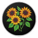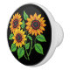 A beadwork-style arrangement of golden sunflowers forms the centerpiece of this ceramic knob. Bright yellow petals, rich brown centres, and leafy green stems stand out against a deep black background, echoing the artistry of Métis beadwork in a functional home accent.