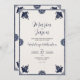 This Mexican Blue Floral Otomi Simple Fiesta Wedding Invitation design features a simple and elegant border, with dark blue floral and bird elements delicately placed in each corner. The central area is left blank, framed by a thin blue line, which provides a clean and minimalist backdrop for the text. The combination of birds and flowers, along with the restrained use of colour, gives the design a sophisticated yet traditional look, inspired by Mexican folk motifs.