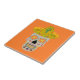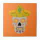 This awesome tile features a graphic design image of a Mexican Day of the Dead (Dia de los Muertos) inspired skull. The skull is a pale grey colour and is wearing a yellow sombrero. It has gold teeth and Mexican Sunflowers, also called Tithonias< instead of eyes. The sombrero has a cactus on it and is covered in pretty swirl patterns and red and green Chilli peppers. The skull itself is covered in pretty coloured flowers of different types.