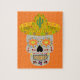 This awesome puzzle features a graphic design image of a Mexican Day of the Dead (Dia de los Muertos) inspired skull. The skull is a pale gray color and is wearing a yellow sombrero. It has gold teeth and Mexican Sunflowers, also called Tithonias< instead of eyes. The sombrero has a cactus on it and is covered in pretty swirl patterns and red and green Chilli peppers. The skull itself is covered in pretty colored flowers of different types.