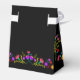 Mexican fiesta flowers favour box - personalised with your name, occasion or other custom text. This colourful design as pretty folk art style flowers in red pink purple and yellow on a black background with pink brush script lettering.
