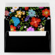 Bright and colourful Mexican Folk Art floral on the inside of the envelope. Black on the outside with address box areas in white with red trim.