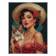 This stunning illustration portrays a glamourous Mexican pin-up in a vintage-inspired ensemble. She dons a wide-brimmed sombrero with intricate lace trim, evoking traditional Mexican elegance. Her glossy, dark curls frame her flawless face, enhanced by bold red lips, winged eyeliner, and a sultry gaze reminiscent of classic Hollywood starlets. A vibrant red rose tucked into her hair adds a romantic touch. She wears an opulent red satin dress with delicate lace embroidery and ruffled off-the-shoulder sleeves, exuding sophistication and allure. In her arms, she gracefully holds a regal, fluffy cat with piercing green eyes, adding charm and mystery to the scene. The deep green background creates a striking contrast, further enhancing the rich, vintage aesthetic of this captivating Mexican pin-up portrait.