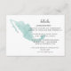 This details card features a watercolor map of Mexico with a tiny heart over Los Cabos. The word "details are in a cursive style font. All the accommodation information is in black and includes a place to add your wedding website info. The back of the card has an aqua green background with the bride and groom's names and wedding date in white. This design coordinates with the other products in the Mexico Map Wedding collection.