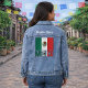 Personalised women's denim jacket features the word MEXICO showing underneath the Mexican Flag, in the same colours, on a denim jacket. Personalise above the flag with a name, in white letters. Great to wear to family reunions, travel groups, and clubs. Wonderful gift for Christmas, birthday, or any occasion.