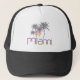 Cool Miami, Florida design with grey palm trees and pink yellow neon typography. Trucker hat design by Inge Lewis. Perfect gift or souvenir for family, friends or visitors. Find more matching items at the ingeinc.com store.
