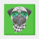 This design features a portrait of pug in with sunglasses and a black and white chequered scarf.