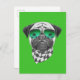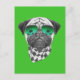 This design features a portrait of pug in with sunglasses and a black and white chequered scarf.