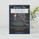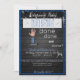 Mic Drop Retirement Party Invitation. Dinner, drinks, hotel, rsvp. Black wood background. Blue and White font.