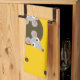 Cute children's illustration of three playful mice peeking out of cheese holes. One mouse peeking from one hole is playfully pulling the other mouse peeking out of another hole by its ear. The whole product is covered by yellow cheese with holes image, so it looks like on big piece of cheese.