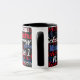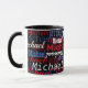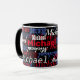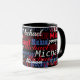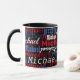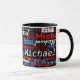 Cool and modern red and blue pattern design... repeating his name in different font styles, printed all over the black surface of the coffee mug.