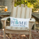 Stylish welcome pillow features "Home" text with Michigan state map and custom text that can be personalised with your family name and the city, state where you live. The heart city marker can be moved to the appropriate location via Customised. Horizontal stripes dress up the reverse side. Navy blue, aqua blue, and white colours.