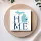 Stylish beverage drink coaster features a typography design with "Home" text and Michigan state map. The navy blue heart city marker can be positioned over the city where you live via Customise. Navy, blue, aqua blue, and white colours.
