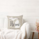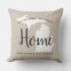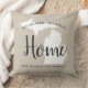 A personalised Michigan Home throw pillow on a warm beige background featuring the white state silhouette with a script Home overlay. Customisable family name and city create a meaningful monogram in an earthy, classic palette, with coordinating stripes on the reverse. A timeless gift for Michigan families who love warm, neutral state pride decor.