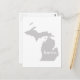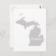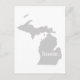 A postcard featuring the outline silhouette map shape of the Wolverine state of Michigan filled in solid grey with the word home inside.
