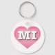 This key ring features a calm, cool, and collected pink heart with a white-washed centre containing the bold white upper case letters MI, the official abbreviation for Michigan, the great lakes state.
