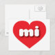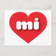 This postcard features a vibrant red heart containing the bold, white, rounded lower case letters mi, a playful abbreviation for Michigan, the Great Lakes state. The reverse side of the postcard is blank, awaiting your customised text or handwritten sentiments.