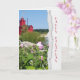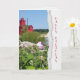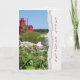 Big Red Michigan lighthouse on pier and pink hibiscus flower with torn edge border for general birthday