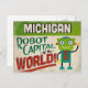 A funny Michigan vintage travel postcard featuring a friendly robot with fun retro style text that says, "Michigan, Robot Capital of the world!"