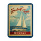 This Greetings From Michigan vintage travel nautical design features a boat sailing on the water with seagulls and a blue sky filled with gorgeous puffy white clouds.