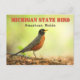 This cool postcard features a stunning photo of an American Robin with the text, "Michigan State Bird, American Robin." Photo created by award-winning photographer Maria Jeffs.