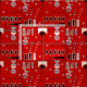 Mid-century modern abstract in red. Design consists of triangles, rectangles, circles in colours black, grey and hints of pale pinkish- cream.