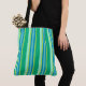 Printed bag in classic, Mid-Century Modern awning stripes in Soft, blended colours, with a centre trellis pattern accent stripe, in light and deep jade green with turquoise and lime green accents