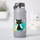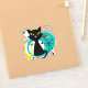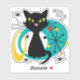 Colourful abstract Mid Century style illustration with black cat, black stars and colourful circles decoration on white background