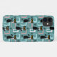Colourful abstract Mid Century style pattern with black cat, black stars and colourful (blue, white, pink) cubes decoration on turquoise background for every cat lover, cat mum and cat dad.