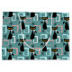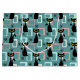 Colourful abstract Mid Century style pattern with black cat, black stars and colourful (blue, white, pink) cubes decoration on turquoise background for every cat lover, cat mum and cat dad.