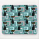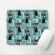 Colourful abstract Mid Century style pattern with black cat, black stars and colourful (blue, white, pink) cubes decoration on turquoise background for every cat lover, cat mum and cat dad.