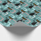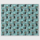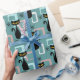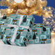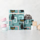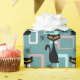 Colourful abstract Mid Century style pattern with black cat, black stars and colourful (blue, white, pink) cubes decoration on turquoise background for every cat lover, cat mum and cat dad.