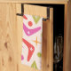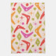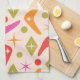Add vintage atomic style to your kitchen with this kitchen towel featuring Mid Century Boomerangs with Starbursts with Diamonds and Circles pattern in Orange, Pink, Red and Green.