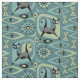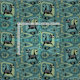 My original vector illustration of mid century style abstract cats, cubes, starbursts, boomerangs, lozenges, and more, in shades of blue, green, grey, and black on teal.