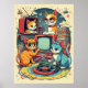 Poster in a whimsical illustration featuring four playful cats enjoying retro media devices. One cat sits beside a vintage TV, while another, wearing red glasses, is perched on stacks of books and records. A turntable and cassette player evoke a mid-century aesthetic.